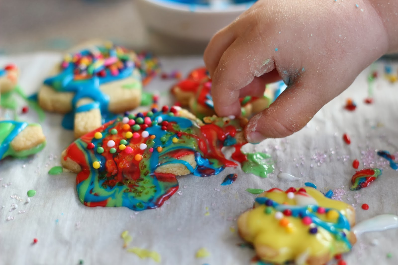 We’re in my hometown of St. Louis with my twin sister and my parents for the holidays. And while we don’t celebrate the religious aspect of Christmas, we truly appreciate and enjoy the spirit of Christmas. We’ve been marathoning Christmas movies and listening to music all month! My three-year-old, Ari, loves the “pretty lights!” and trying to spot “Olaf the snowman” from Frozen. Each year our family makes and decorates sugar cookies. This year, Ari took the reins and made a beautiful mess in the kitchen.