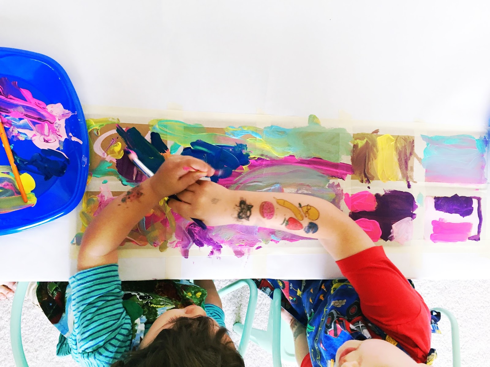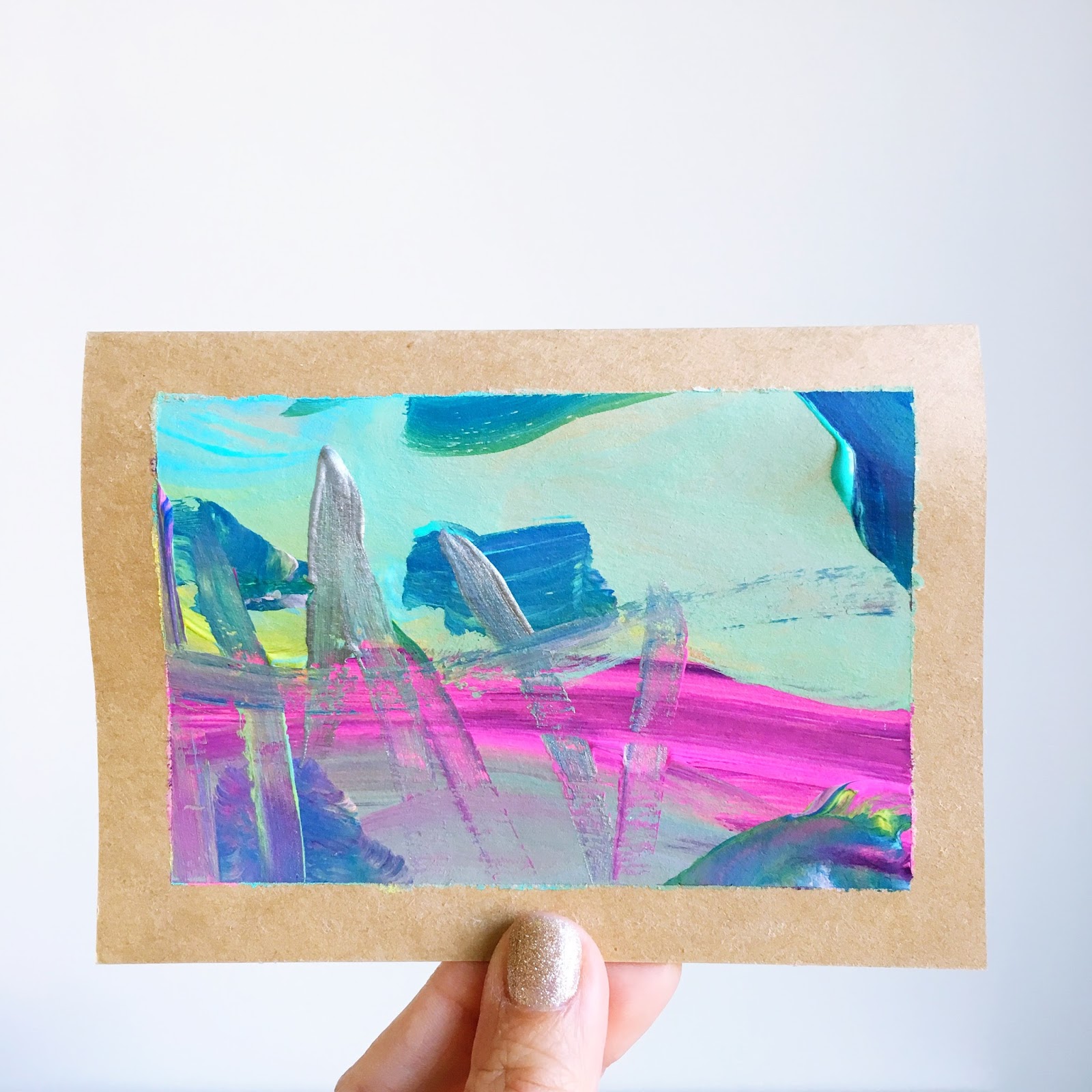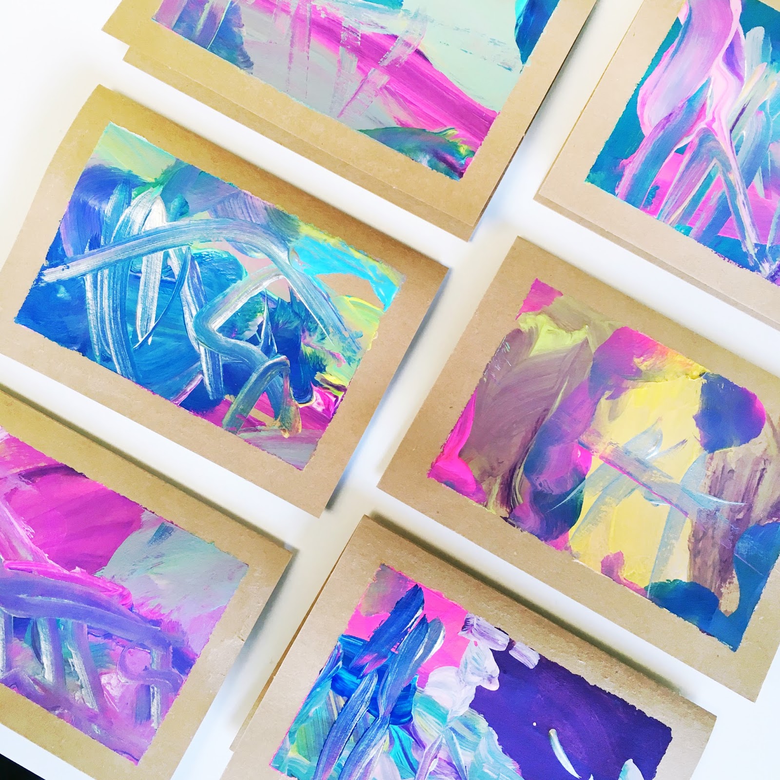 Have your kids fill each card with paint edge to edge. I like to choose the paint colors myself so that they turn out sort of nice no matter what! Start with warm tones, then cool, then have them finish with a clean skinny brush for a metallic paint.