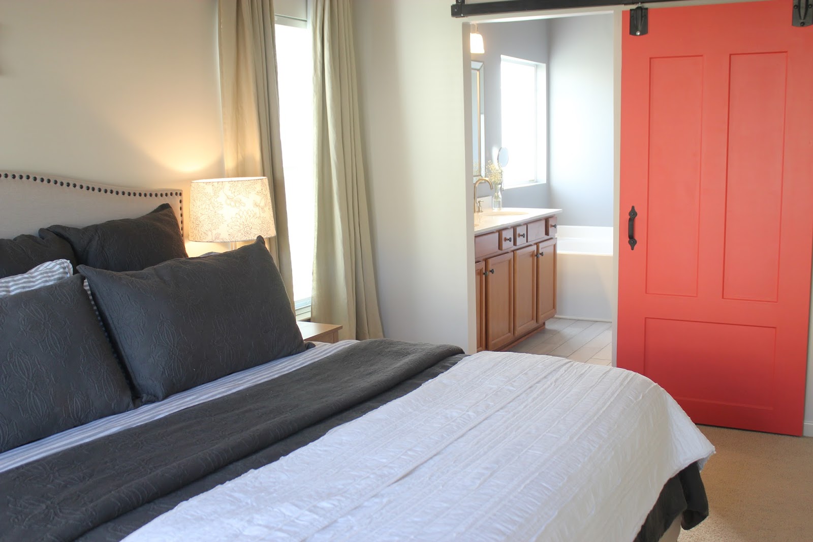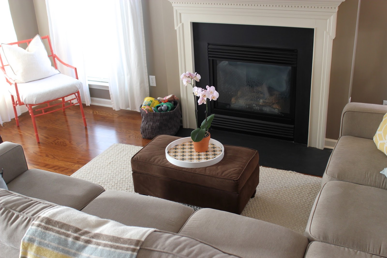 My husband is not touring these next couple of months, which means he is HOME and I am putting him to WORK! Lots of things get left undone when he is away, so we have a lot of catching up to do. We are currently in the process of ridding our walls of the flat builder’s paint that has been here since we moved in, and painting them in Behr’s lovely “Chocolate Froth”. It is a lot of work, but so worth it! I absolutely LOVE this color! We painted our guest room with this color, and I knew immediately that I wanted it in every other room in our home!