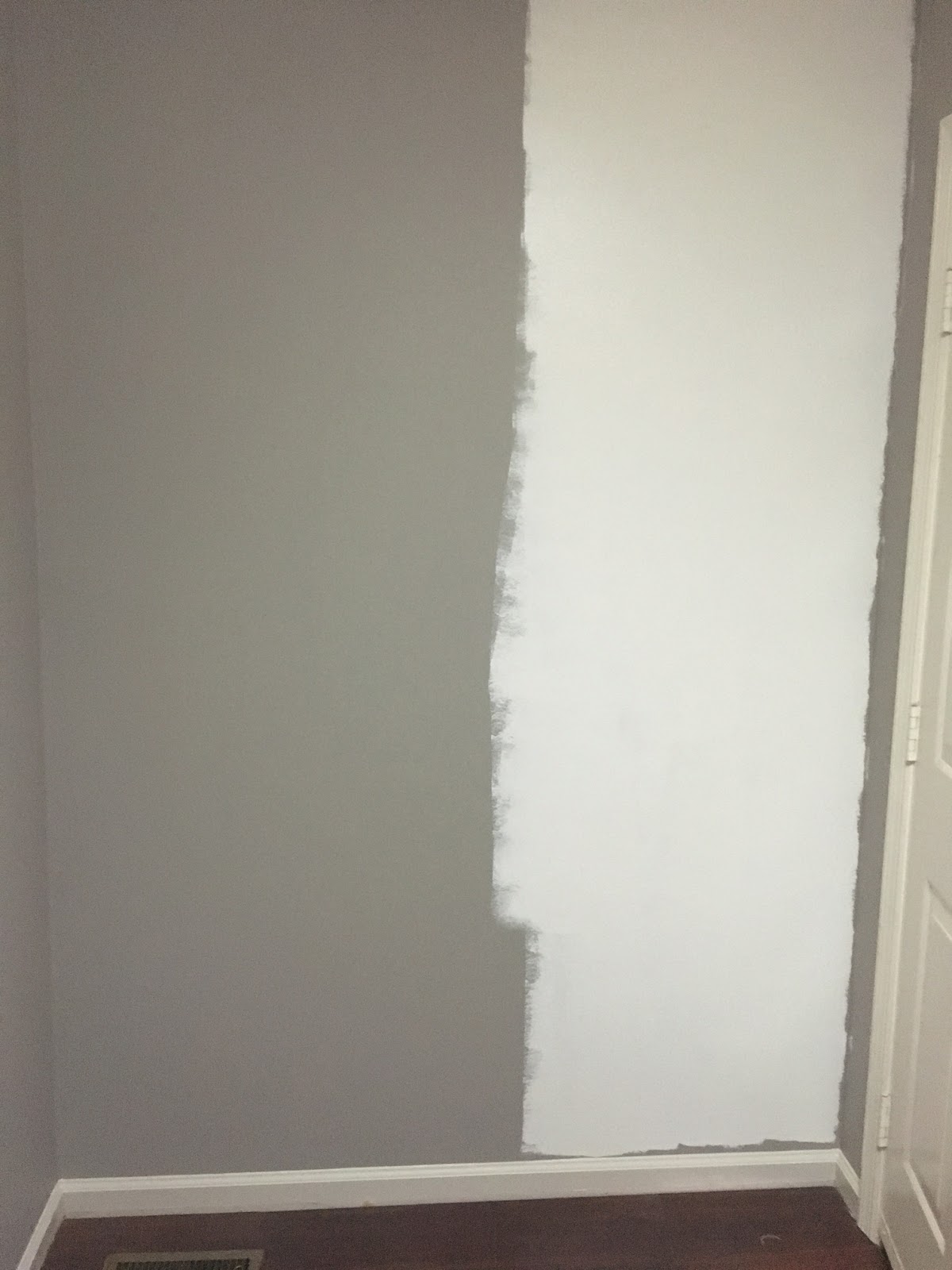 First, I had to pick the colors that I wanted to use. White is not just white, and black is not just black guys. I wanted a specific warm white with a softer black shade. I ended up going with BM’s White Dove and Space Black. Space Black actually looks like a true navy when it is put up against something black, but on the wall…. it is “black” and perfect! This was my wall before ( kind of). I may have gotten a little paint happy before snapping this photo. It was just a dark grey room with no windows that needed some serious brightening.