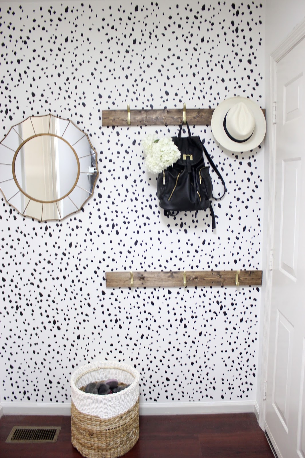 I recently became obsessed with all things dalmatian, and wondered how I could incorporate this print into my home. I just wanted that one scene stealing wall in my home. I toyed with doing removable wallpaper, but truthfully, it was a bit pricey for a laundry room. Also, what if I want something different in the future? I just didn’t want to deal with removing wallpaper. With stencils, you can use paint and just paint right over it and even use the stencil on a different wall if you want. The more research I did, I felt confident that I could handle doing a stencil… on my own….for the first time. Well, I was at least going to try.