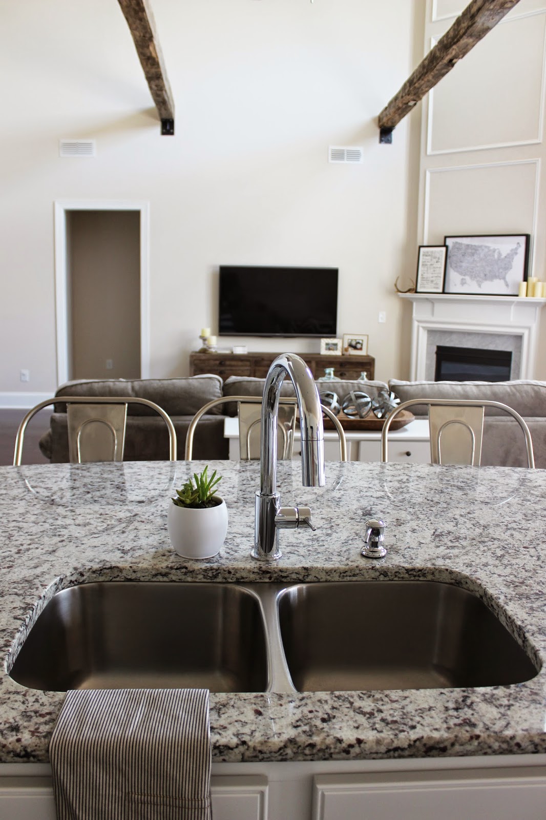 This room, being a double story felt a little too open and cold, so we added beams a couple months ago. It’s changed the whole feel of the house to us- we are obsessed! The Tenneessee Barn Project found these 100-year-old hand hewn beams in an old barn. We love all the beautiful inconsistencies in these beams and the iron supports that hold them up. Industrial chic at it’s finest! I still have plans for a laundry room makeover and a new kitchen table from them eventually!