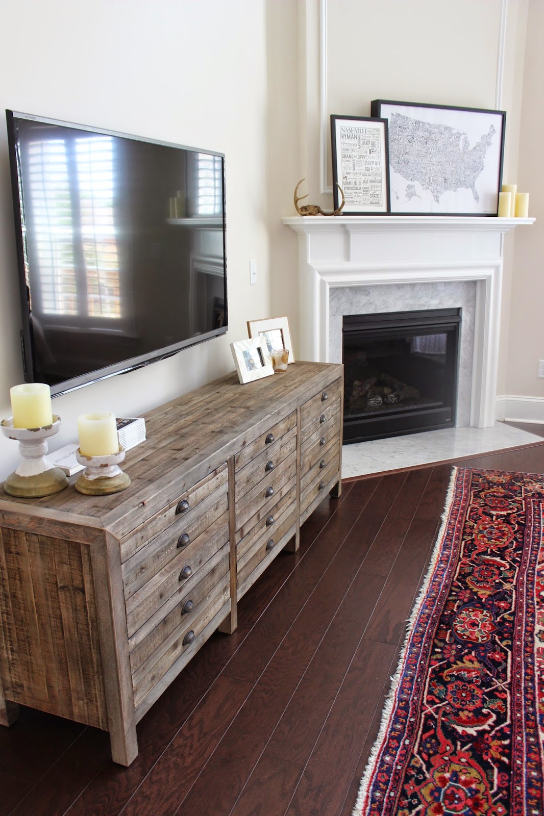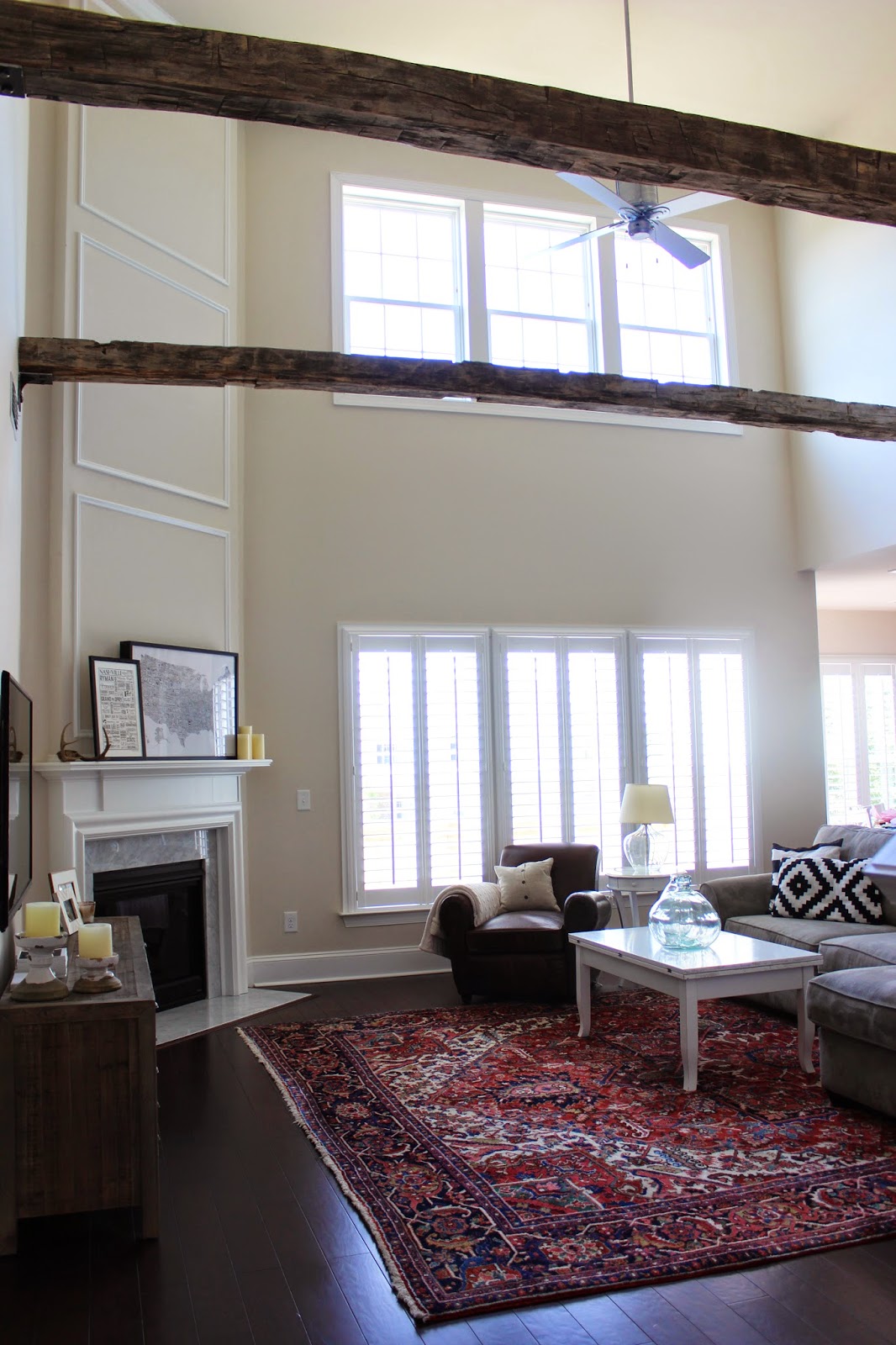We love this room for two main reasons: the rug and the beams! The oriental rug was passed down to us from Jeffrey’s Nanaw (she truly was a fabulously glamorous lady), and I love every little detail on there. It makes the room warm and cozy, and we love thinking of Nanaw each time we look at it!