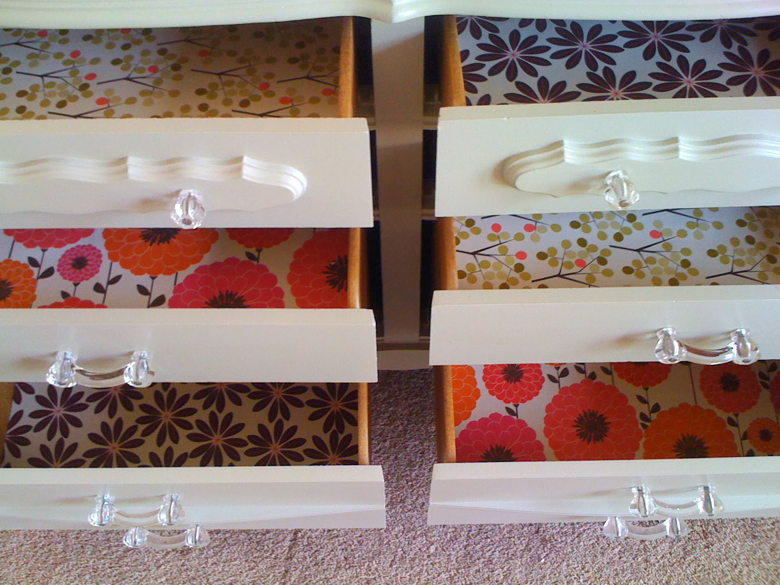 ^ Found this old french provencial looking dresser on Craigslist. I painted it gray and added my own handles. I lined the drawers with Snow & Graham wrapping paper from Rock Paper Scissors ^