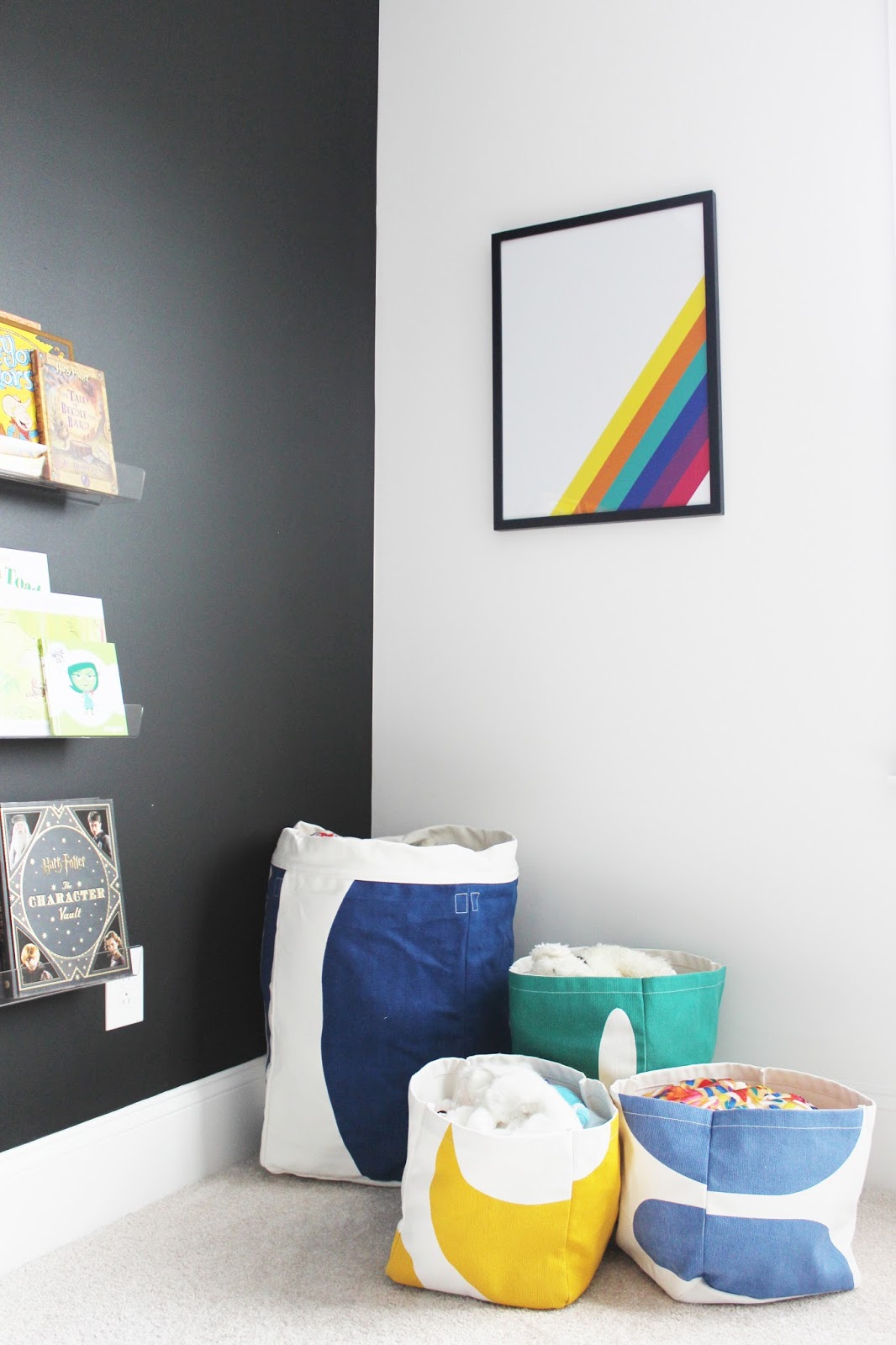 You know when your kid gets to an age where all of a sudden they have super strong opinions on what their room should look like? Ari is 5 now and wanted rainbows and gold painted all over the walls with Harry Potter posters. This was not going to fly. BUT I think I pulled off a combination of rainbows, Harry Potter, and my love of black and white modern style. Now we’re both happy!! Scroll down for all sources and a free printable of the modern rainbow poster.
