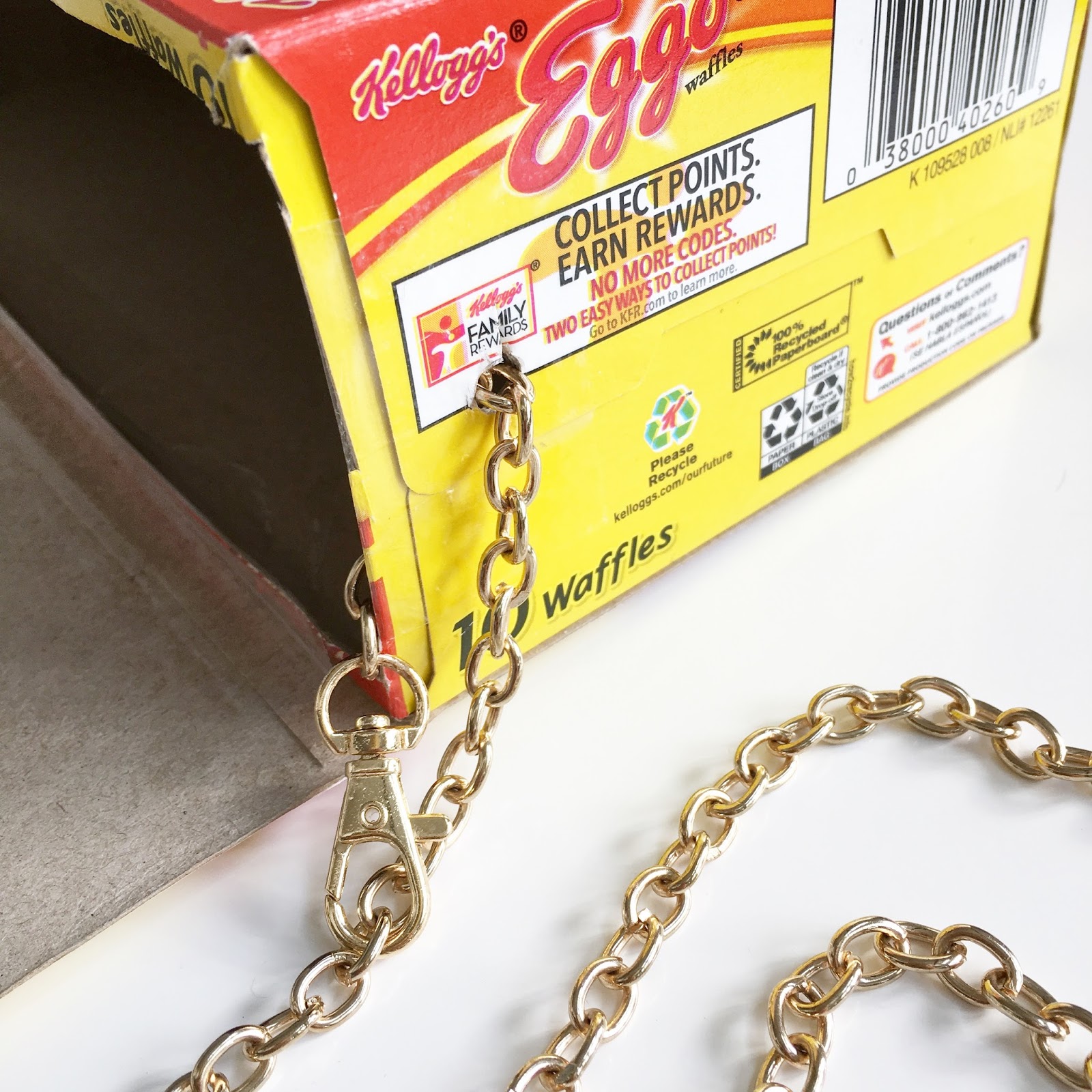 9. Now you can thread your purse chain through and attach it to itself. You can adjust the chain strap at this point. Link to purchase the chain strap is below. This one is actually from clutch I own!