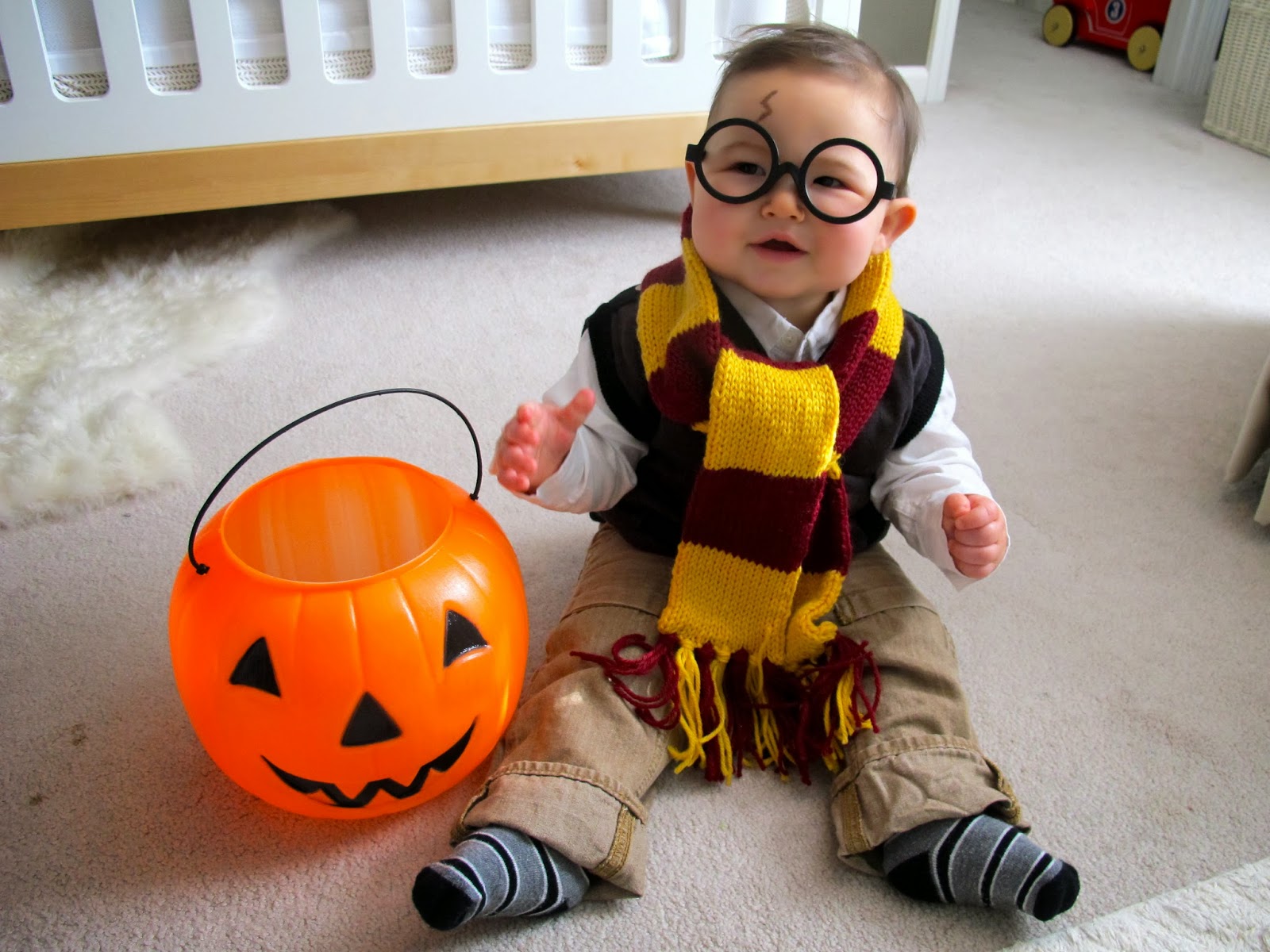 This was my laziest costume but effective. Max already had the white onesie, cardi, and bowtie. I just put masking tape on Ari’s Harry Potter glasses (above)!